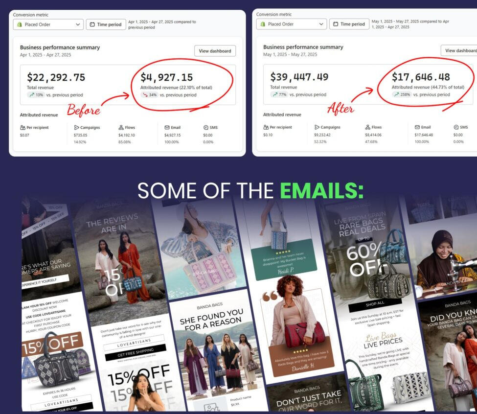 For Vanda Bags, revenue grew 258% in just 90 days - jumping from $4,927 to $17,646. This surge boosted email's share of total revenue to nearly 45%, turning it into a major driver of online sales.