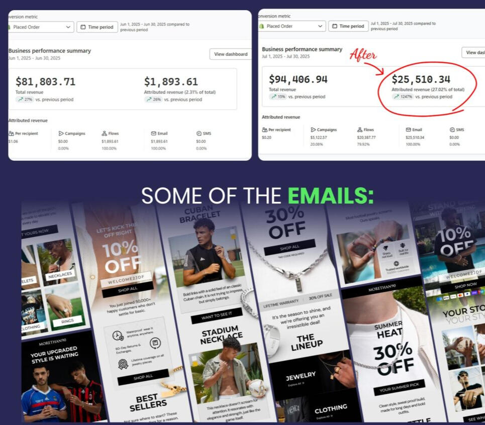 For More Than 90, revenue grew 1,247% in just 30 days - jumping from $1,893 to $25,510. This transformation boosted email's share of total revenue to over 27%, making it a major sales channel almost overnight.